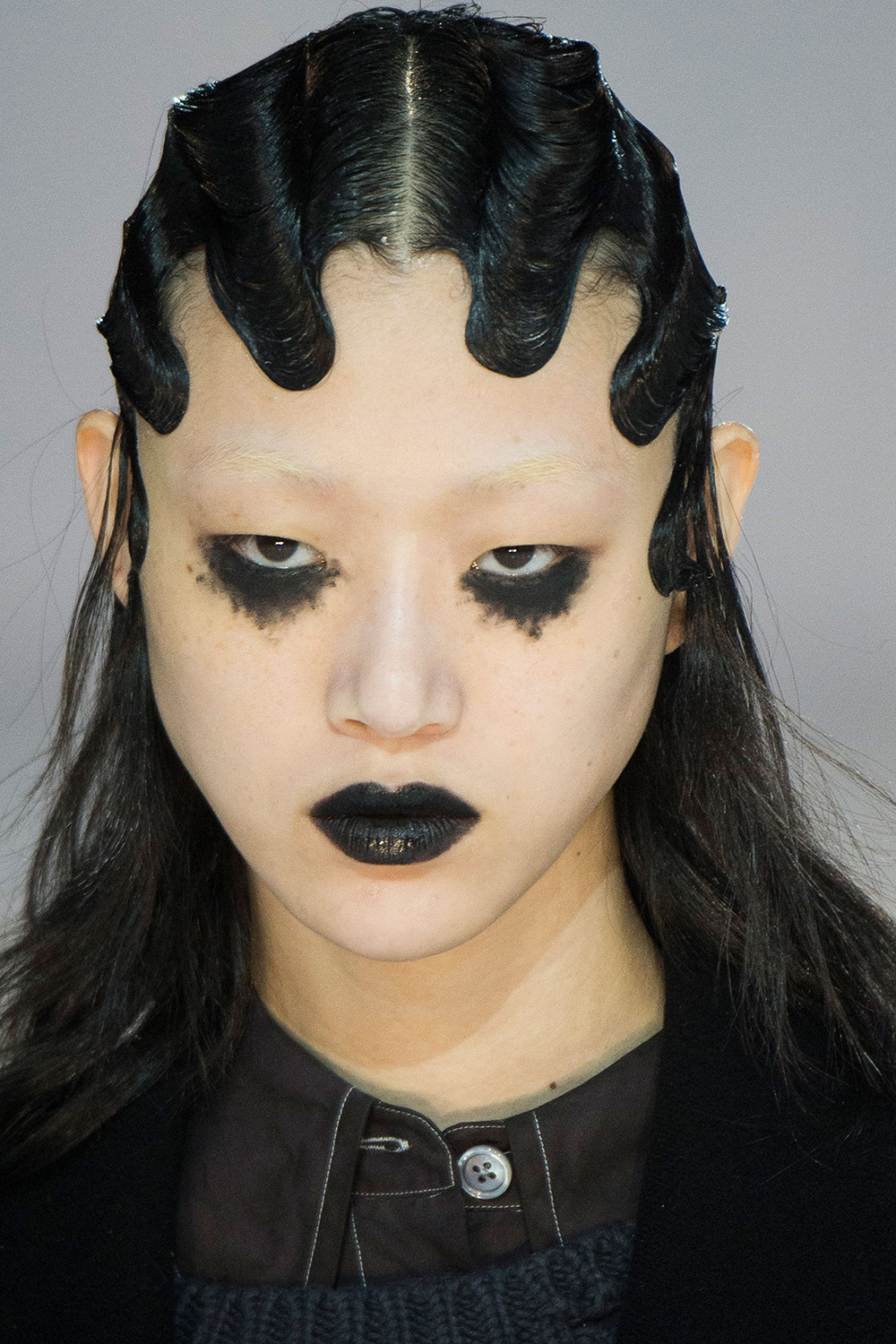 哥特人是时装中不断出现的一个母题,因此黑色唇膏是一个常盛的经典。要想得到更美的效果,可参照肯达尔·詹娜 Kendall Jenner 在克里斯汀•迪奥 Christian Dior 的 AW16 秀台上的妆扮,诱人的黑眼睛、光滑的边分发型以及泛着光泽的黑色嘴唇。也可参考吉吉-哈迪德 Gigi Hadid 为蕾哈娜 Rihanna 的 Fenty Puma 所做的妆扮:苍白的中性肤色、磨砂黑嘴唇和漂白的头发;一件成人服装穿在格林童话中的失足少女身上。与之相反的是 Marc Jacobs AW16,减少了温斯特·亚当斯式的酷,多些 Alice in Chains 式的虚空,戏剧性的黑色色调,起伏的发际线,漂白的眉毛,重摇滚的气质。或者,如果要人间最华丽的骷髅,可参考 Thom Browne SS14:向后梳的松散灰蜂窝发型,刷白的脸,任性的红嘴唇和死亡凝视,模特简直是在俯瞰众生。