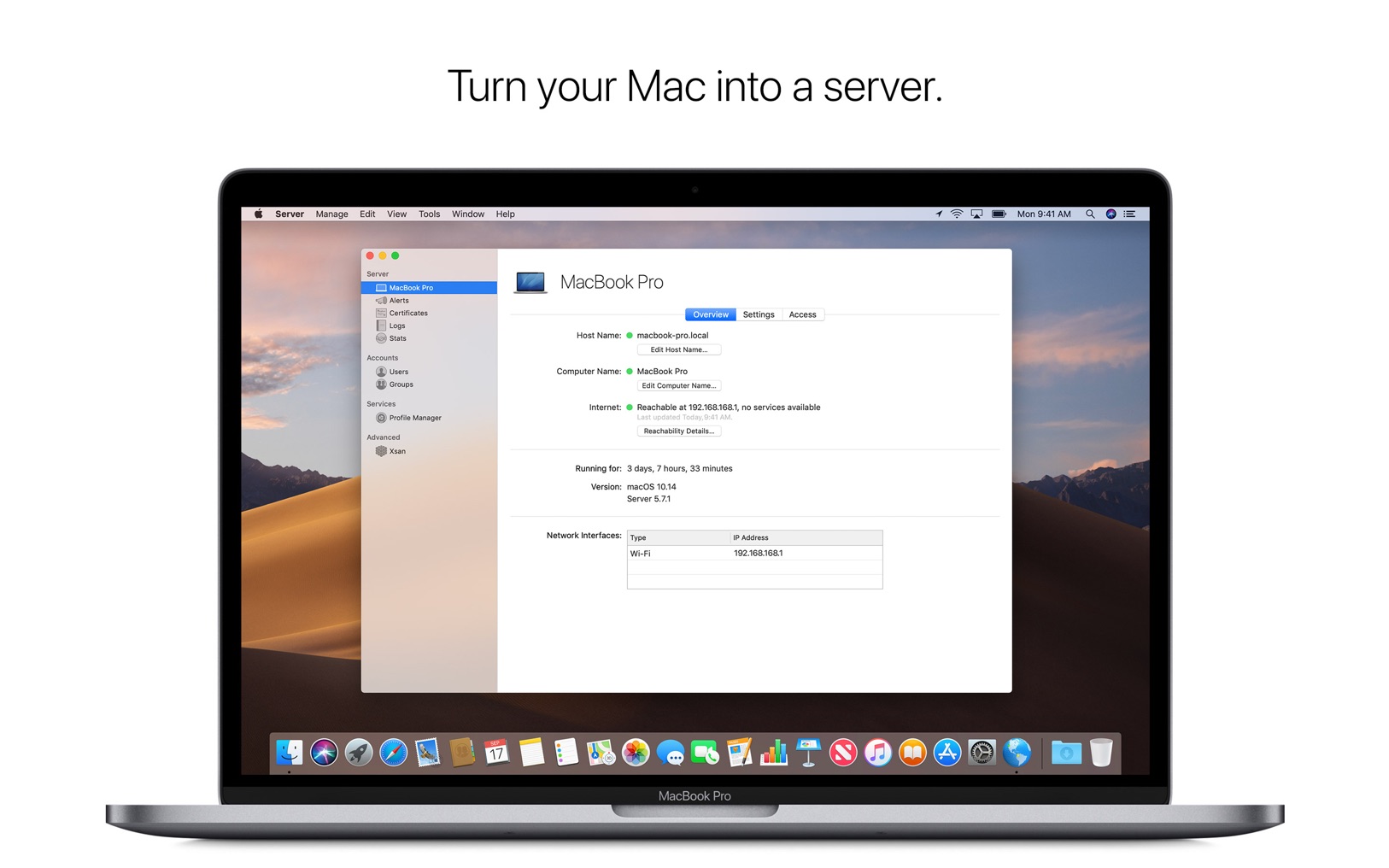 使用macOS Server ,可以轻松配置和监视Mac,iPhone,iPad和Apple TV设备以及网络存储量。