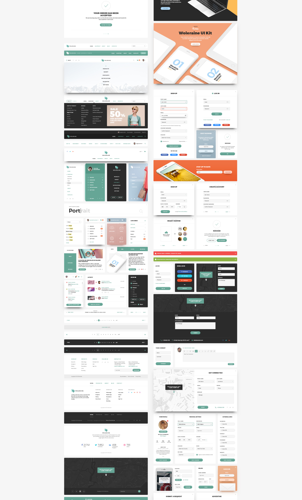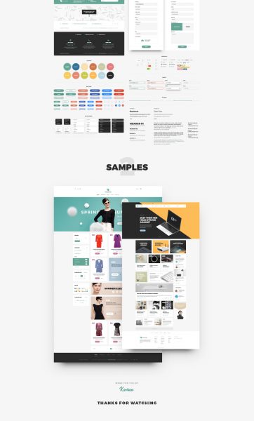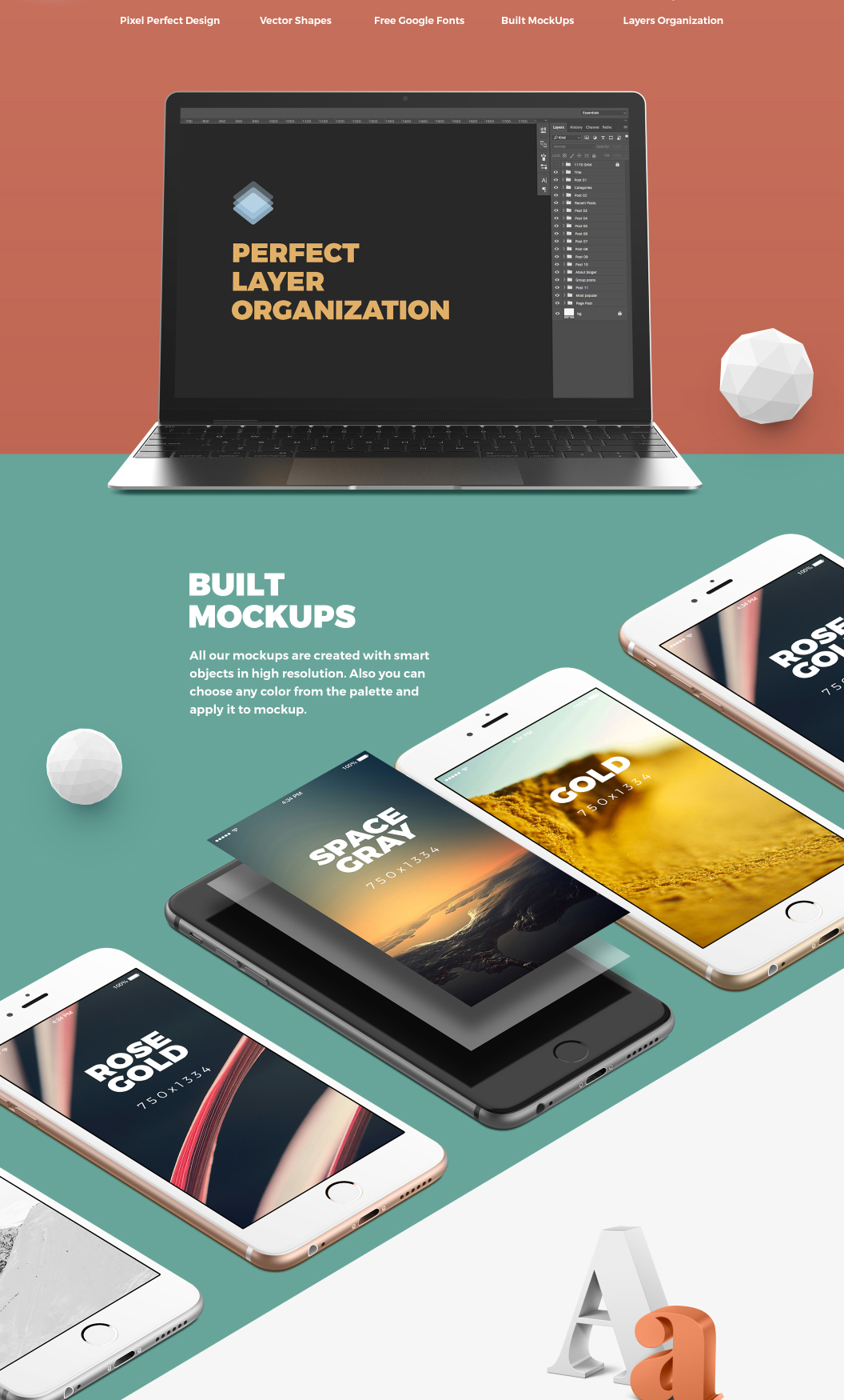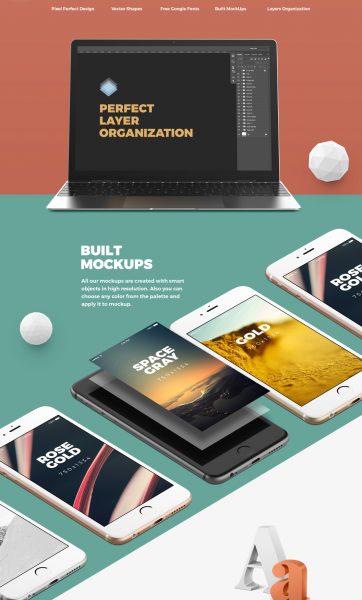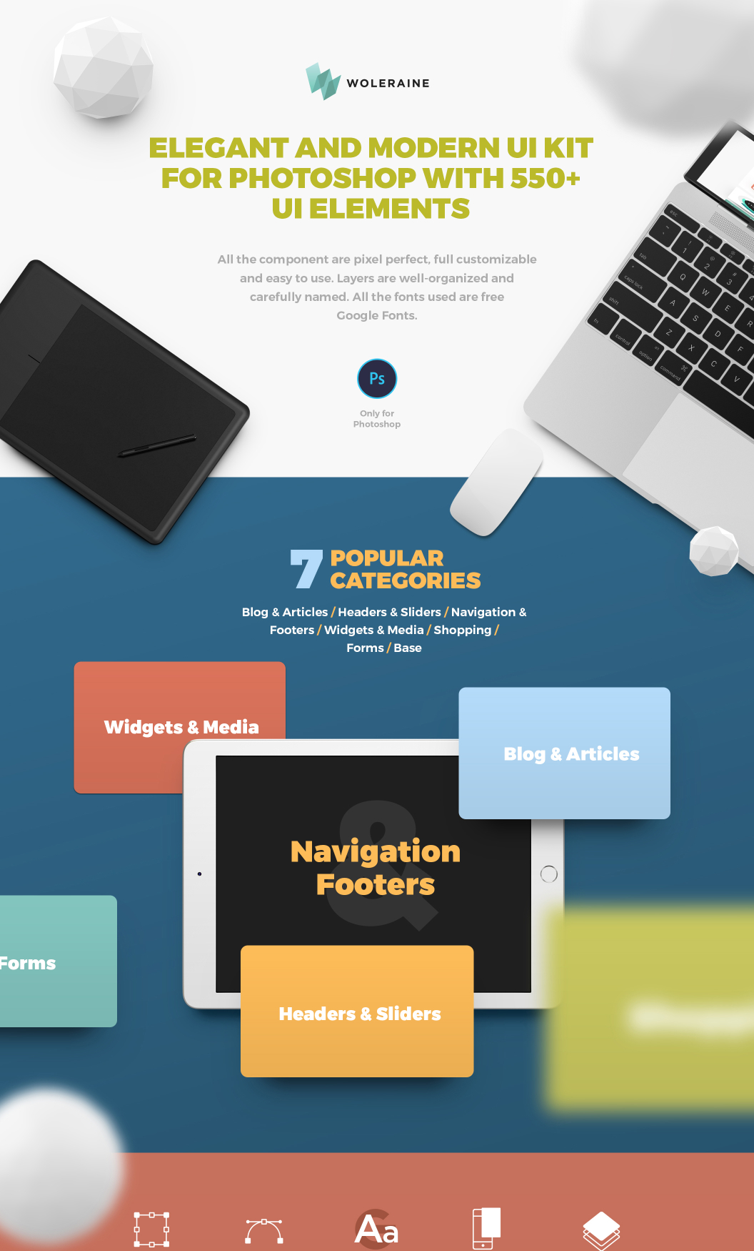 一套非常优雅和现代PS UI工具包,共7大类和550 + 元素。所有组件都完全可定制和易于使用。层次分明,命名清晰。所有使用的字体都是免费谷歌字体。所有的样机都是使用高分辨率职能对象创建,你可以通过调色板更改样机颜色。