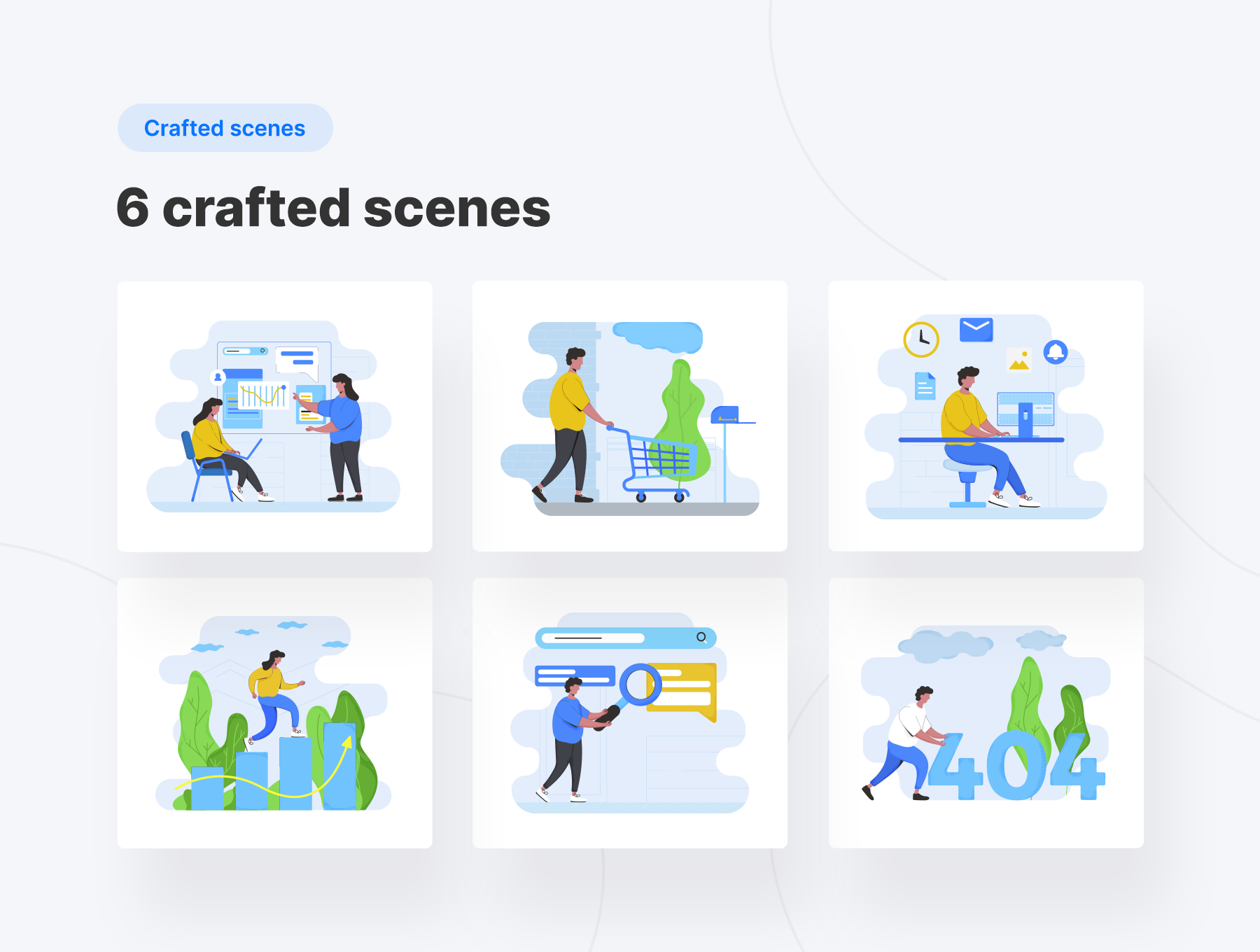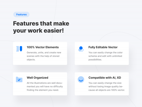 这是一组高级矢量插画,可帮助您使产品更加时尚和有吸引力,您可以将其用于移动项目和台式机,它非常适合!集合中的所有网页插画均为100%矢量,并且可以更改,在不损失质量的情况下,您将不难更改调色板或更改任何对象的大小。包含以下文件格式:Ai,XD,EPS,PNG,SVG。