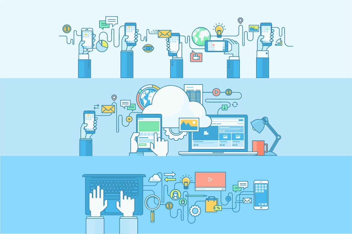 线性设计风格的移动电子商务、移动服务和应用程序、云计算、社交媒体、社交网络、数字营销概念插画/Banner插画。Zip中包括eps、jpg文件。