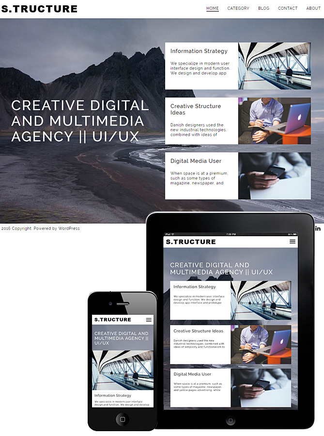 STRUCTURE 是一款响应式(Responsive ) WordPress 付费主题,十分适合用于创建企业网站。主题设计非常干净简约,采用最小布局排版,兼容移动端浏览器。