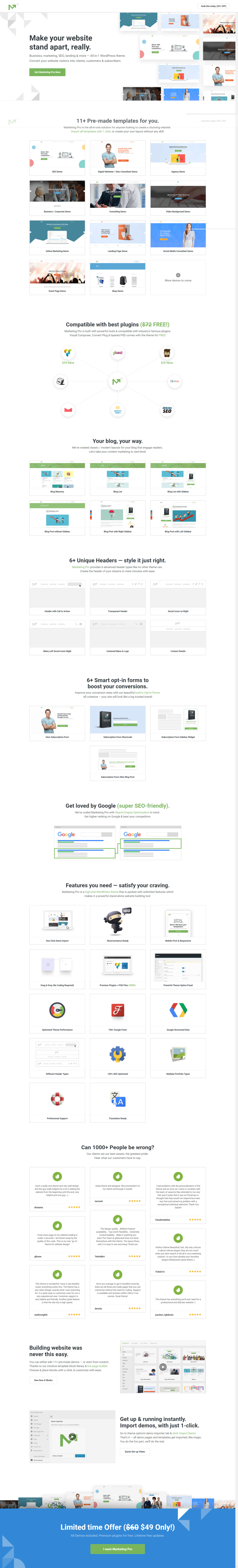 Marketing Pro 是一个全方位的营销 WordPress 主题,专为数字/在线营销,SEO 专家和企业准备,它专注于在营销、SEO、登陆、企业网站。这个 WordPress 主题拥有9 +现代化设计和高转换现成模板。这个主题是由一个拖放页面生成器预先包装,以确保您可以快速和简单创建您的网站,而无需任何编码知识。 如果正准备搭建一个产品、营销或者企业官网,极力推荐该主题,功能非常强大实用!