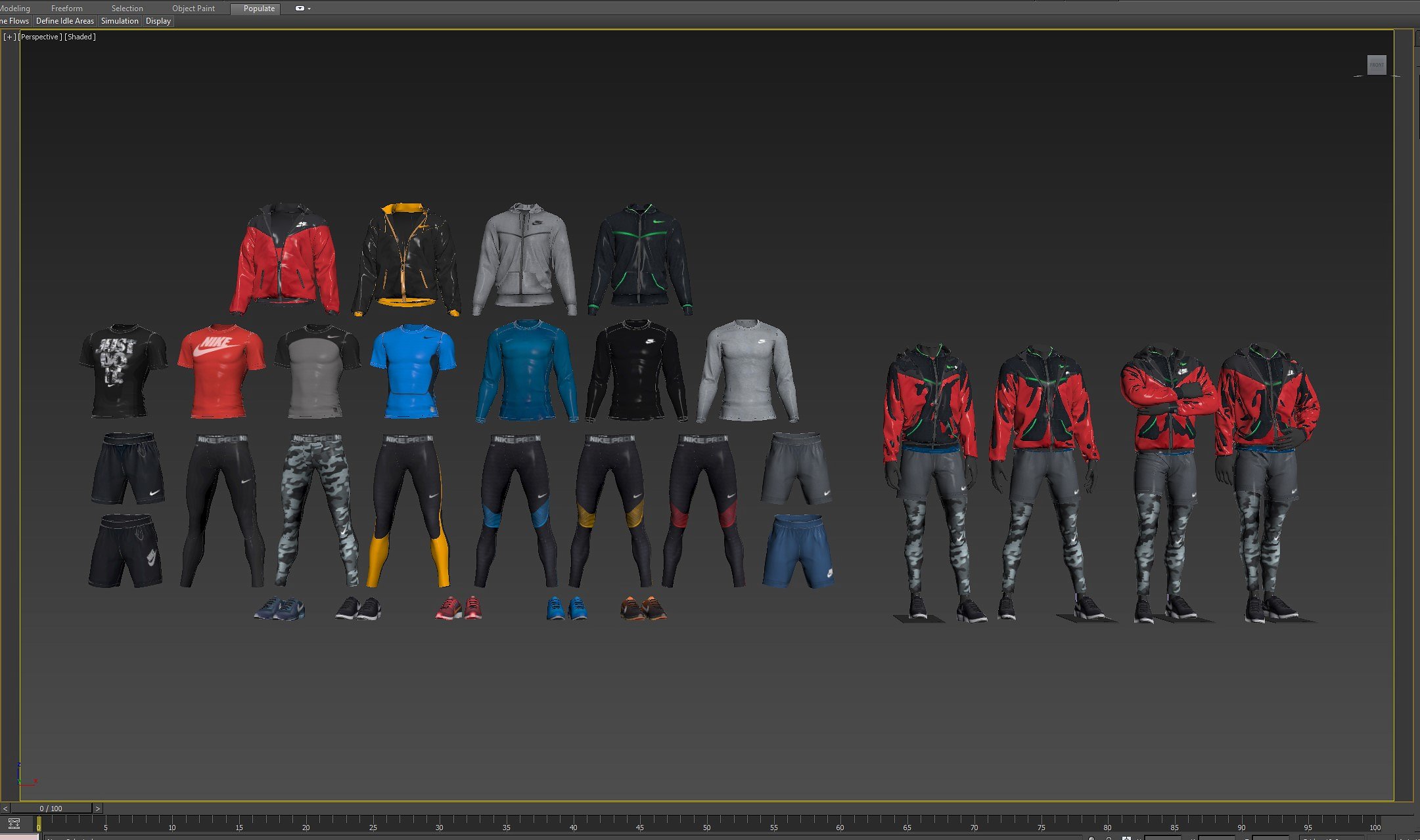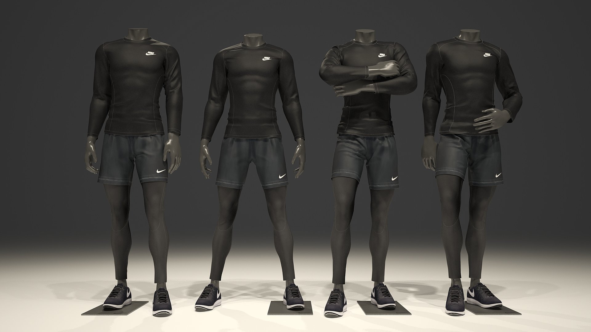 耐克NIKE服装店运动男装模特样机展示模型mockups(3Ds MAX),不同的姿势。服装的每个姿势的七个要素:连帽衫,外套,短裤,T恤,长袖,紧身衣,运动鞋。几种颜色选项所有服装都在MARVELOUS DESIGNER中创建易于更改颜色和图案文件是在3d max 2014中创建的。存档包含扩展名为.max .fbx .obj的文件。Vray材料和位图图像也在里面。3Ds max的场景包括所有衣服中的4个人体模特,以及分开所有衣服的颜色,以便于快速更换(查看最后的预览)所有场景 – 7 750 000个多用途,4 017 000个用衣服的人体模型〜1 100 000多晶硅,60万立方米