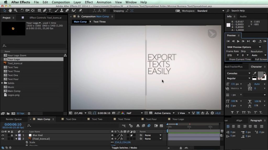 Text2Spreadsheet V1.005 – AE一键支持电子表格 storey 8年前 147 0 Text2Spreadsheet将AE项目中的文本导出到电子表格,您可以使用Microsoft Excel,Apple Numbers或Open Office等应用程序轻松修改它。 完成编辑后,只需单击一下即可将更改应用于AE项目。电子表格易于阅读,并且还支持多种版本的文本,非常适合将项目翻译成不同的语言,或将文本发送给客户进行审核。 評論留言 取消回覆評論前請先 登入。